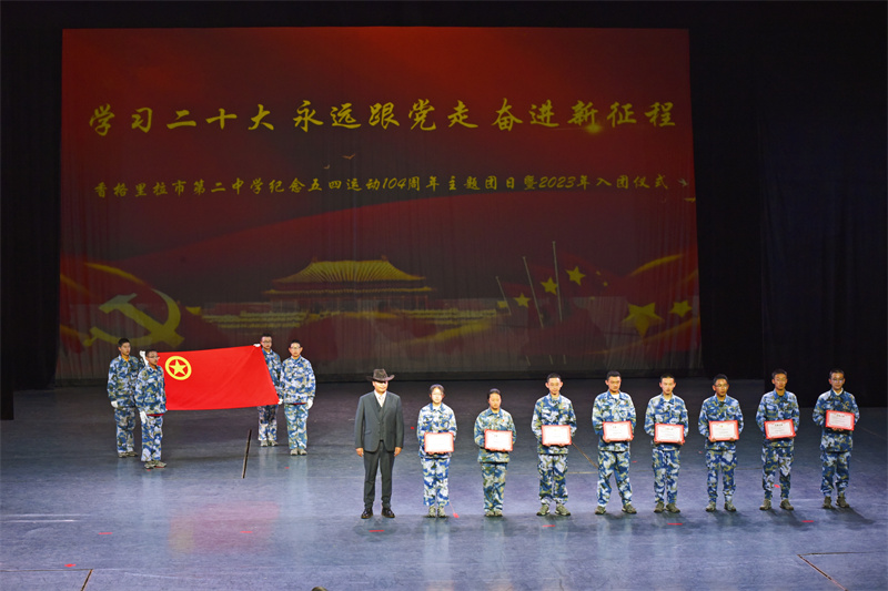 在文藝匯演前,學(xué)校為8位優(yōu)秀團(tuán)員頒發(fā)證書(shū),并舉行了紀(jì)念五四運(yùn)動(dòng)104周年主題團(tuán)日暨2023年入團(tuán)儀式,65名新團(tuán)員佩戴團(tuán)徽莊嚴(yán)宣誓。