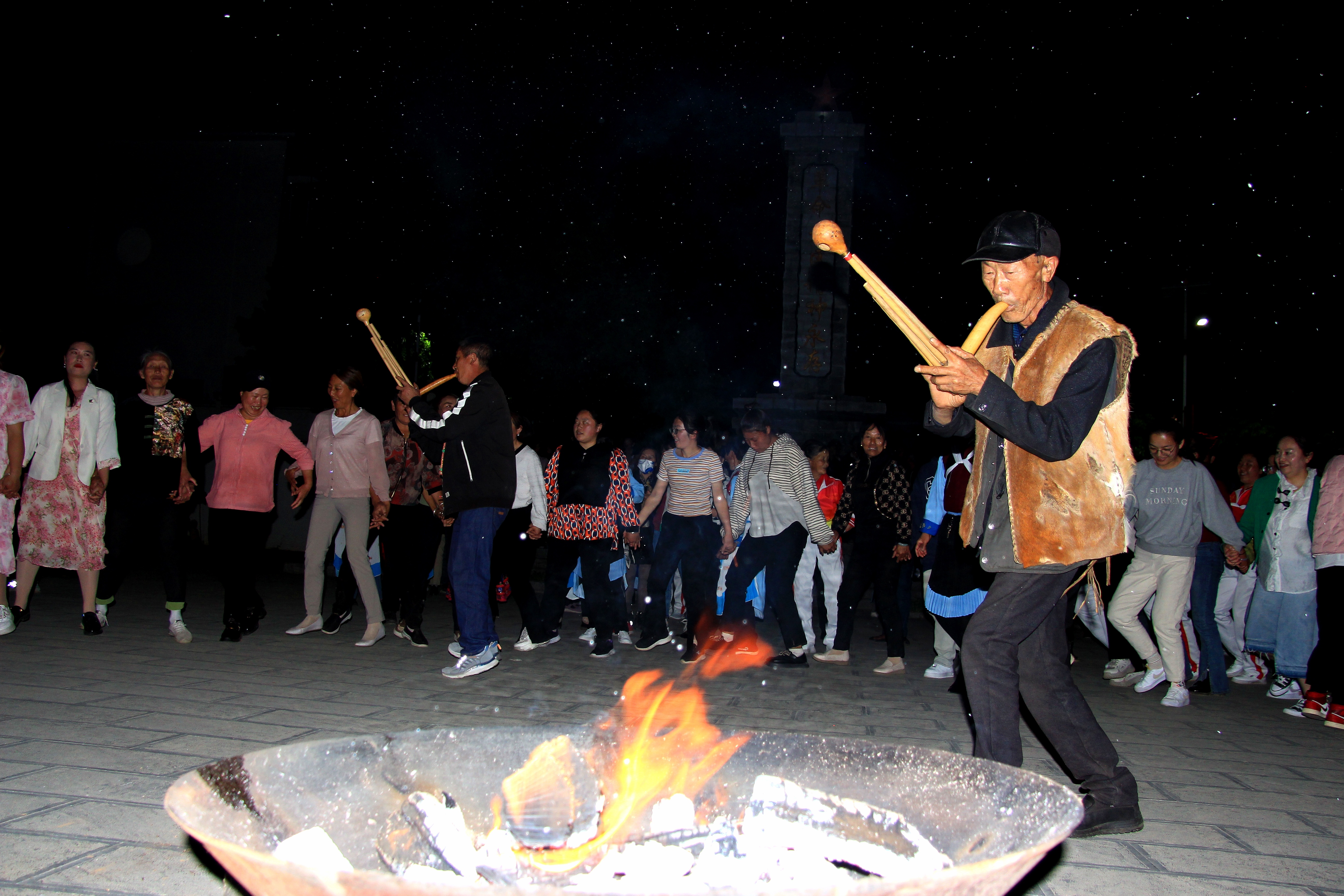 打跳開(kāi)始了,不斷有圍觀群眾參與到打跳當(dāng)中,打跳選手手牽手把篝火圍了三四圈,篝火的映照下,大家臉上的笑容又燦爛了幾分。打跳歌曲從勁爆葫蘆絲換到納西三部曲又換到大蠻調(diào),換了無(wú)數(shù)首,而參與群眾仿佛不知疲倦一直激情打跳著,現(xiàn)場(chǎng)非?;馃?。