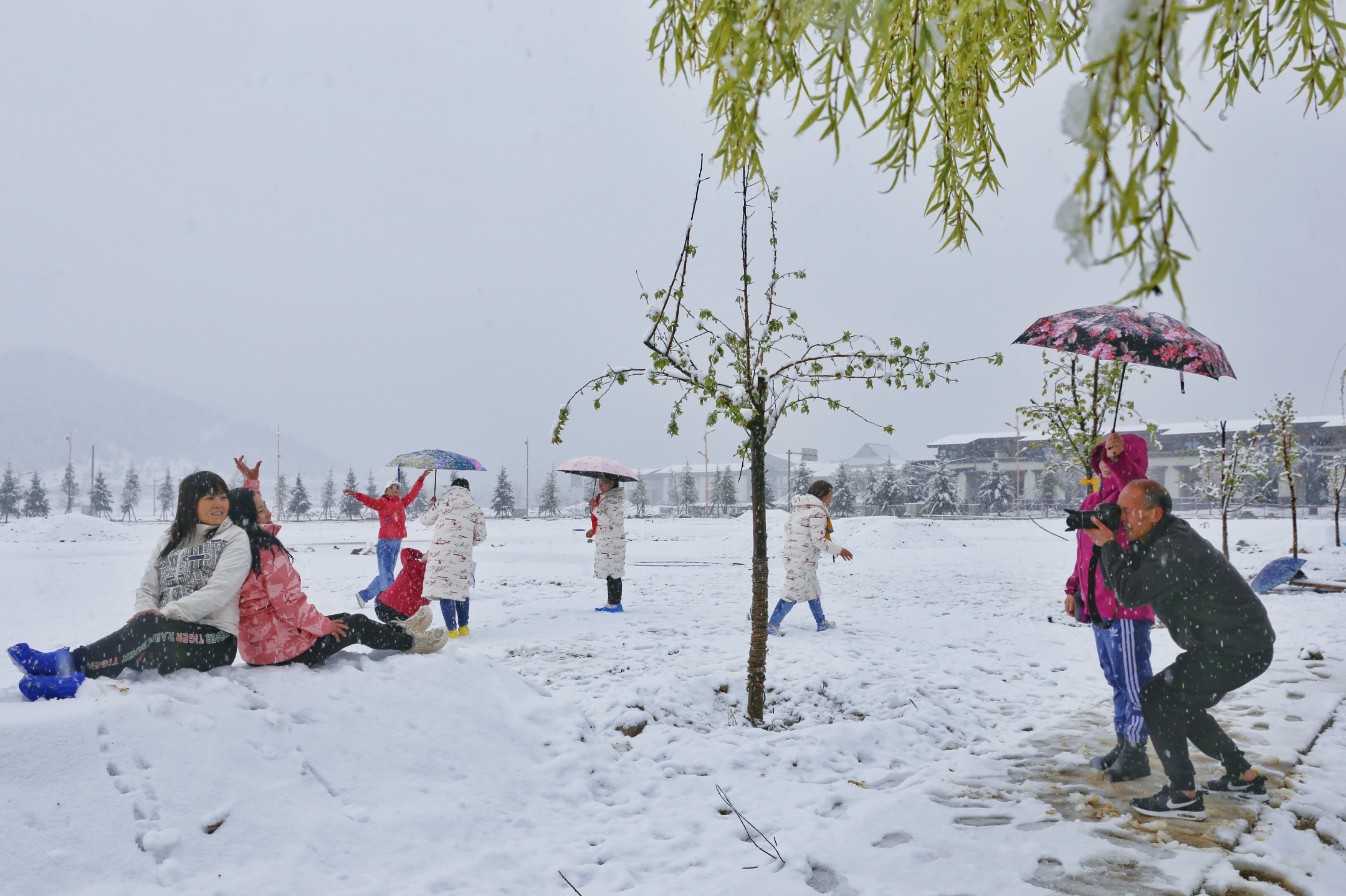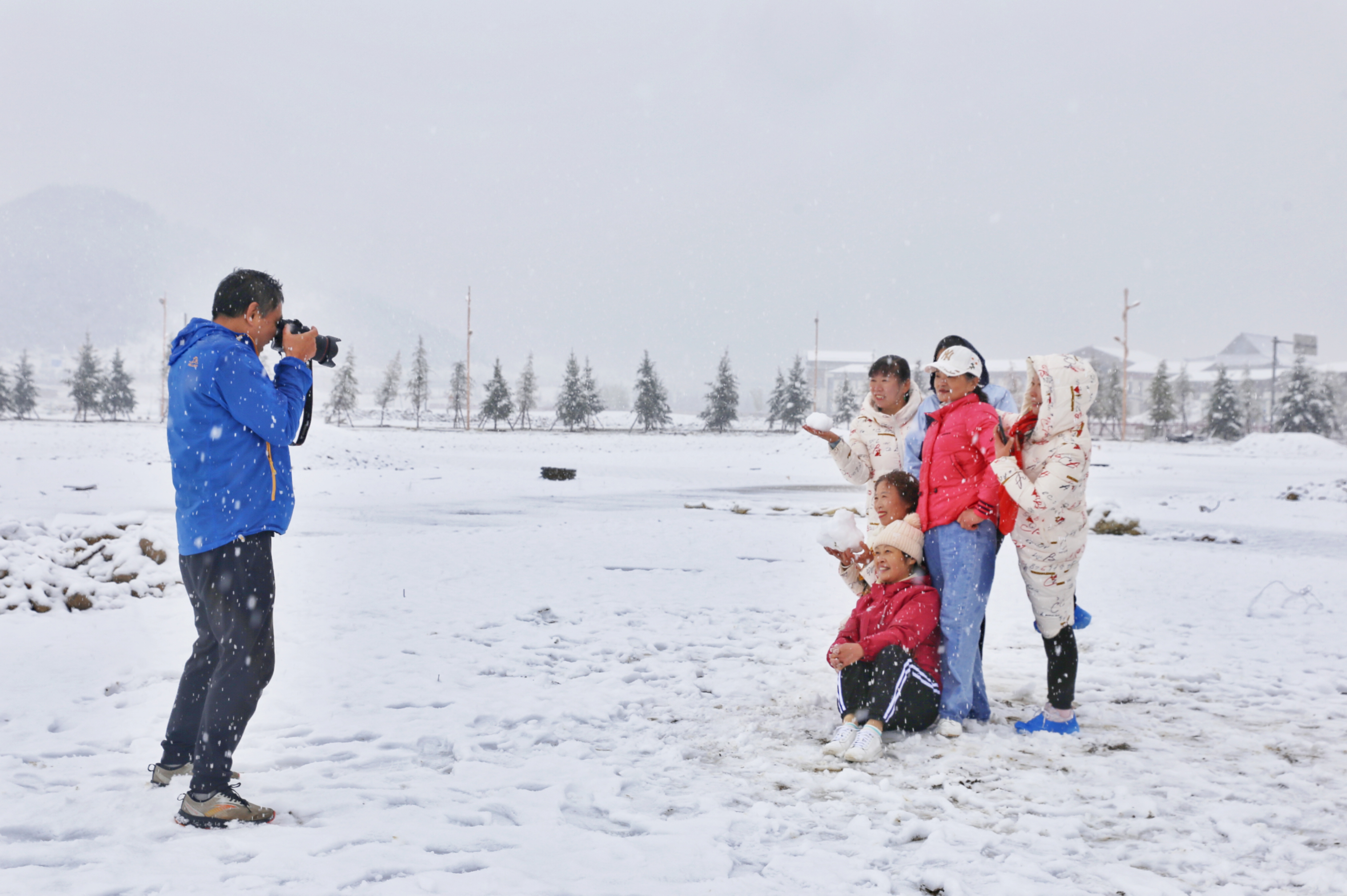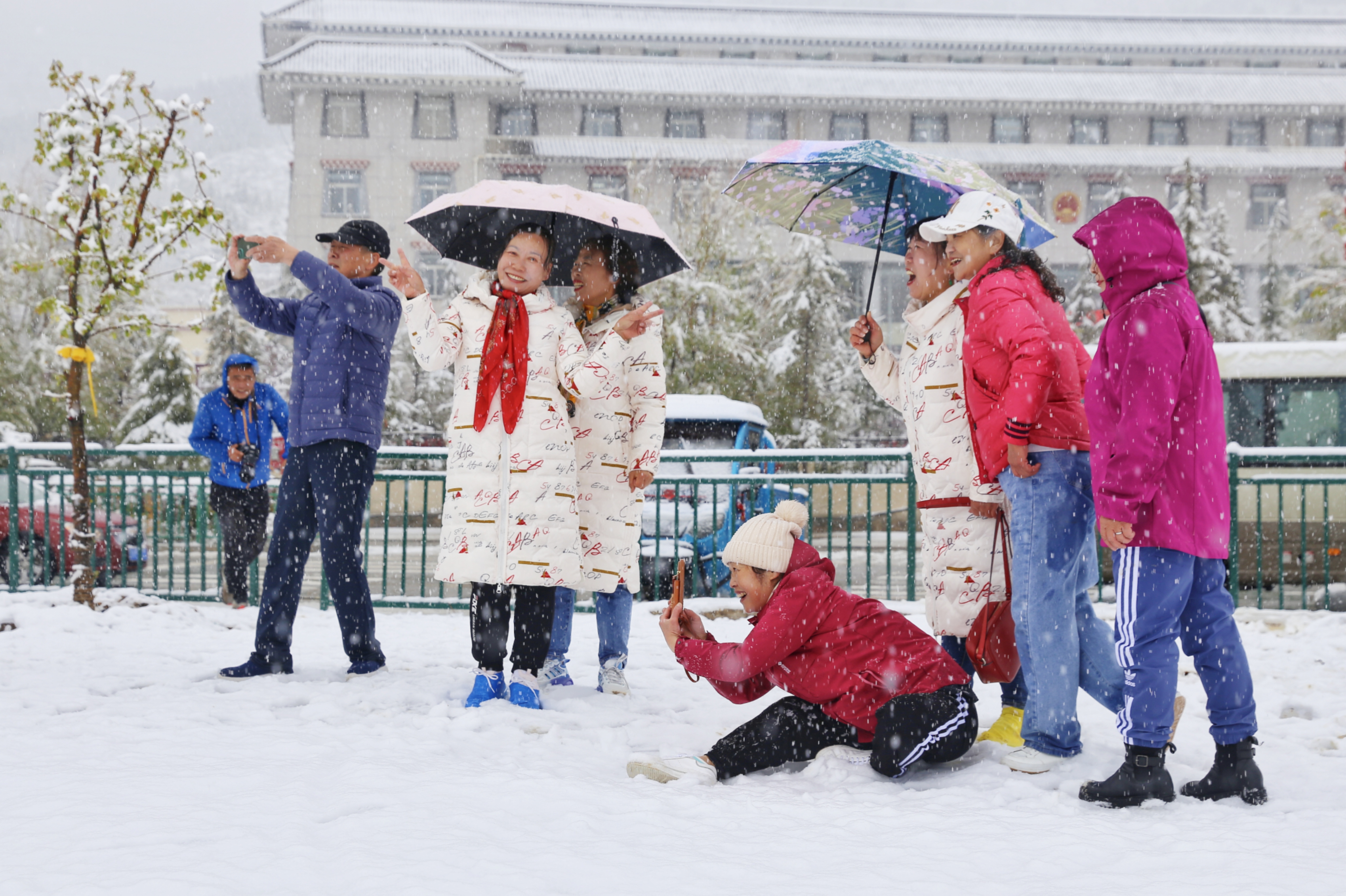 5月15日,香格里拉迎來一場(chǎng)夏雪,大雪紛飛的雪地中一群來自貴州的“嬢嬢團(tuán)”正興奮的玩雪、拍照,“太有意思了,五月也能玩到雪,很難得?!苯衲?5歲的劉嬢嬢告訴記者,她們?cè)谙愀窭锢瓮嫒奶炝耍裉鞙?zhǔn)備返程,出城路上被雪景吸引便索性再留出半天時(shí)間看雪。雪地中的嬢嬢們精氣十足,捏雪球、劈腿、下腰、打滾……大家紛紛擺出自己最拿手的pose拍照記錄下這令人驚喜的美景。