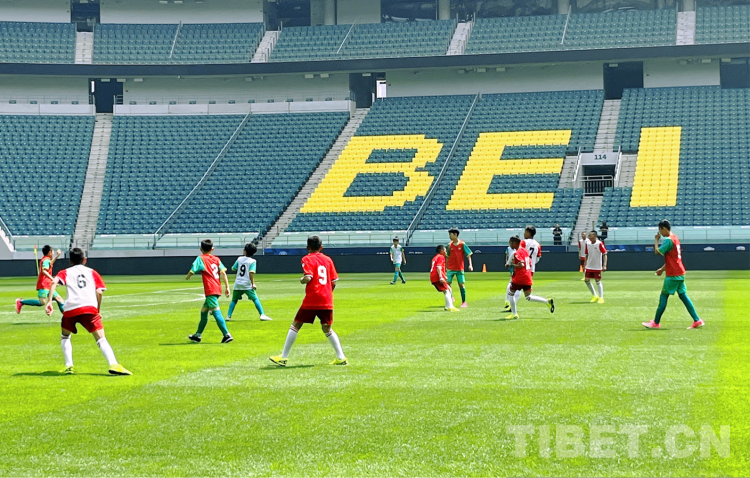圖為玉樹(shù)少年們?cè)诠と梭w育場(chǎng)與北京國(guó)安少年足球隊(duì)一起訓(xùn)練交流比賽 攝影:王茜
