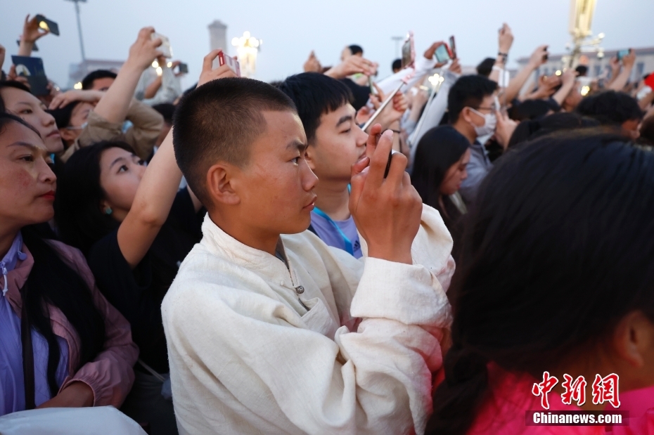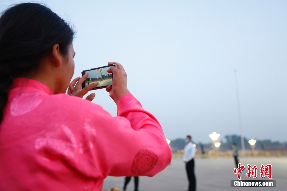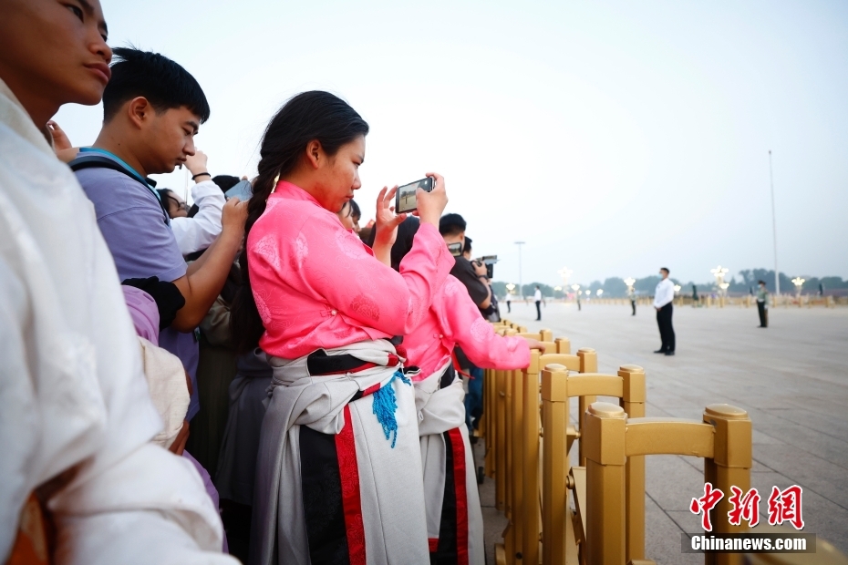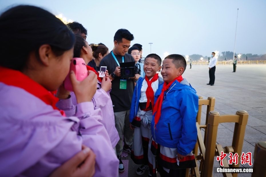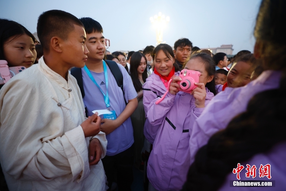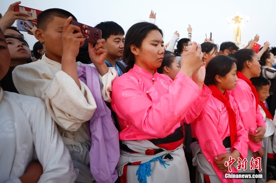 圖為青少年在天安門廣場(chǎng)看升旗。中新社記者 富田 攝
