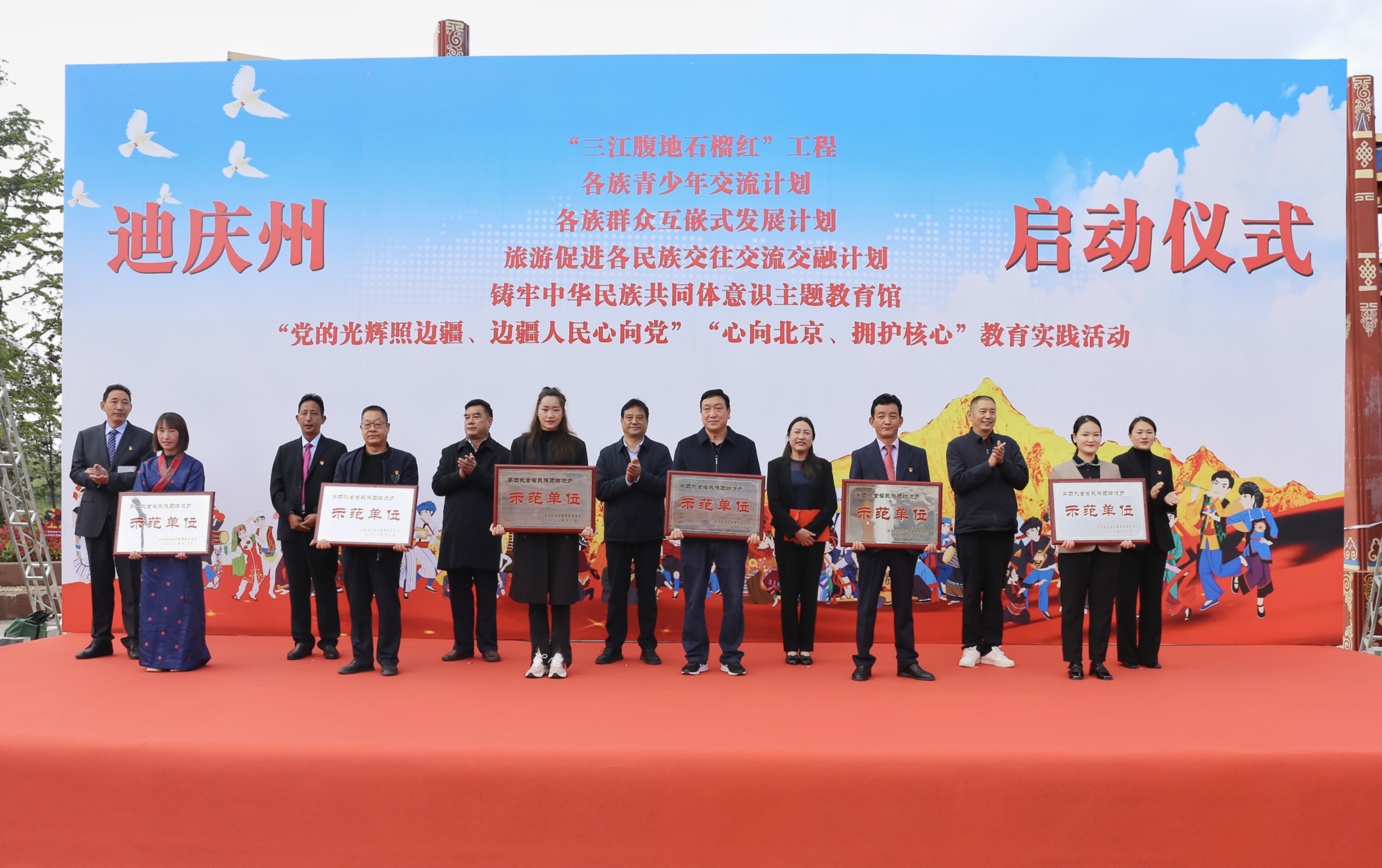 啟動(dòng)儀式上,迪慶紅軍長(zhǎng)征博物館被授予“云南省鑄牢中華民族共同體意識(shí)教育實(shí)踐基地”牌匾,并向2022年榮獲“云南省民族團(tuán)結(jié)進(jìn)步示范單位”的代表授牌。