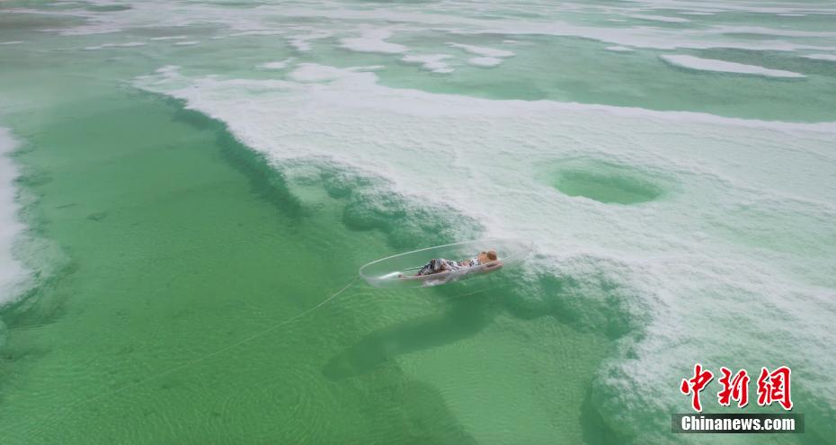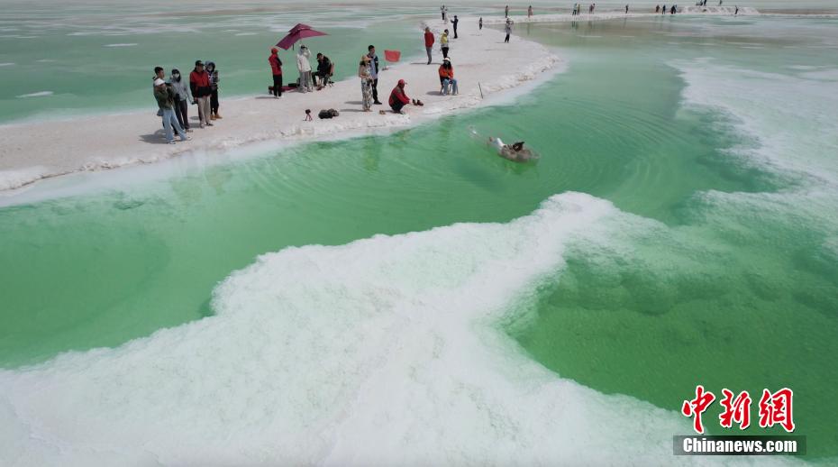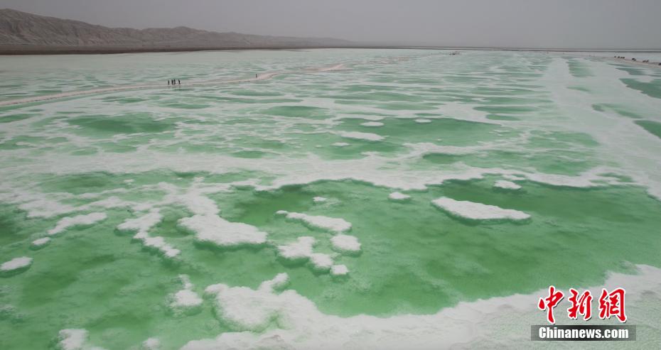 夏日,位于青海海西州茫崖市花土溝鎮(zhèn)的翡翠湖宛如色彩絢麗的油畫被描繪在蒼茫的柴達(dá)木盆地上,淡青、翠綠、深綠色的湖水如碎玉散落在大漠戈壁上,充滿生機(jī)。茫崖翡翠湖南依昆侖山,北靠阿爾金山,總面積約26平方公里,屬于硫酸鎂亞型鹽湖,由于所含礦物質(zhì)濃度的不同,致使湖面顏色深淺不一。18日,由中新社青海分社,青海省海西州茫崖市委、茫崖市人民政府共同主辦的“赴蒼茫之崖品人間煙火”青海·茫崖2023美食大會(huì)在茫崖市正式啟動(dòng)。近日,活動(dòng)團(tuán)隊(duì)來到茫崖翡翠湖進(jìn)行拍攝采風(fēng)。