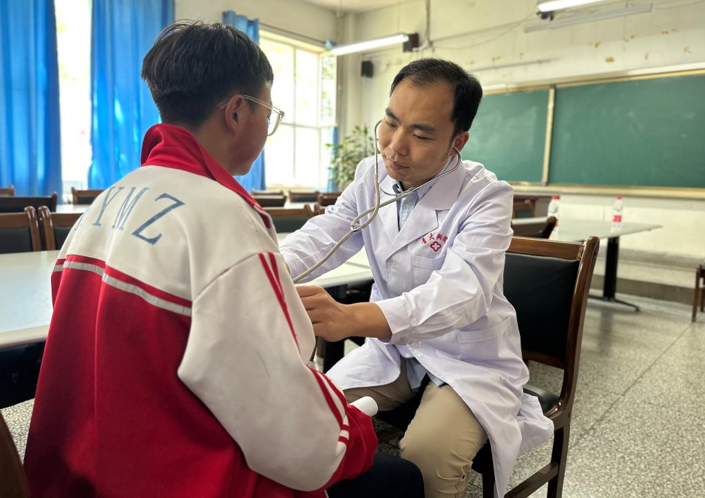 教學(xué)樓里,10名北京協(xié)和醫(yī)院的專家兩人一組,為200名學(xué)生進(jìn)行骨科、眼科、兒科綜合檢查?!翱凑胺健E宕餮坨R后一定要按期復(fù)查。課間可以摘下眼鏡按摩一下,避免過度用眼。”北京協(xié)和醫(yī)院眼科專家李冰一邊拿著檢眼鏡細(xì)心檢查,一邊耐心地講解用眼知識。