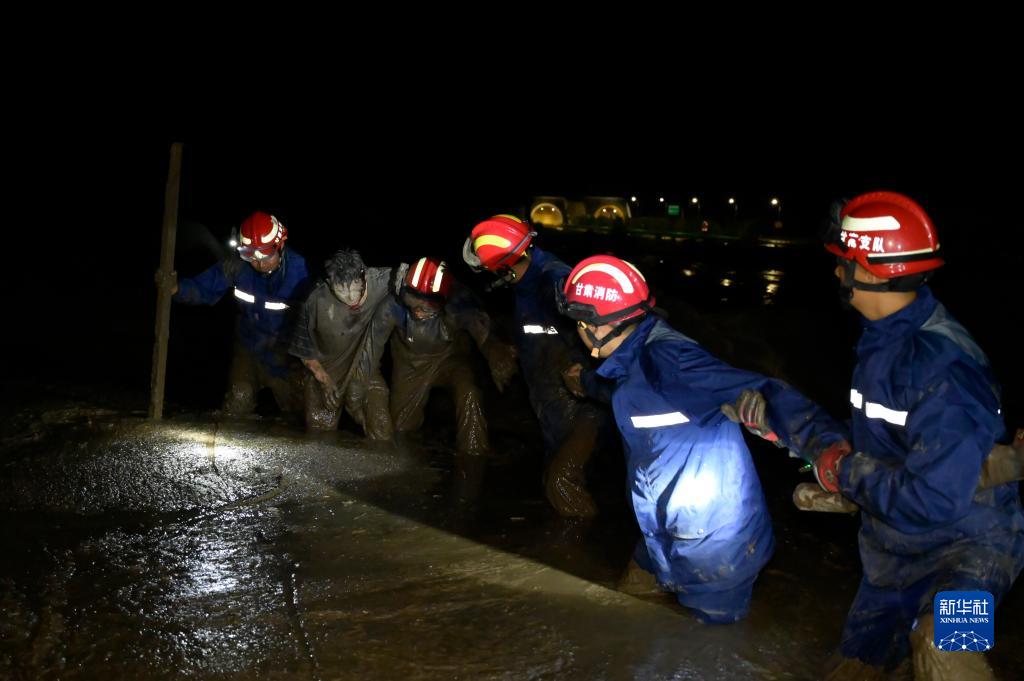 7月11日凌晨,當(dāng)?shù)鼐仍α吭陂_(kāi)展人員搜救工作。新華社發(fā)(夏河縣消防救援大隊(duì)供圖)