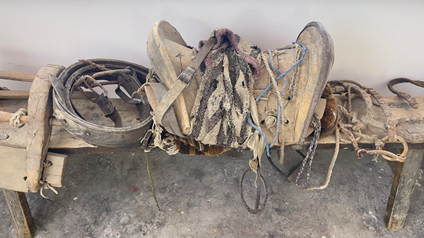 圖為五里村村史館展覽的過(guò)去運(yùn)輸貨物和生活必需品上山的馬駝?dòng)镁?。新華網(wǎng) 陳穎 攝