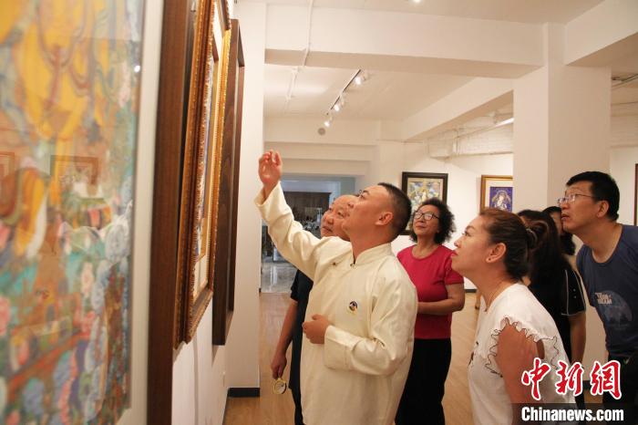 近日,當代熱貢唐卡最具影響力人物之一桑杰本的系列作品《十二生肖》在遼寧省沈陽市九方禾谷藝術(shù)館進行東北首展,其兒子、徒弟關(guān)卻諾日在現(xiàn)場為觀眾帶來講解。沈陽市九方禾谷藝術(shù)館 供圖。
