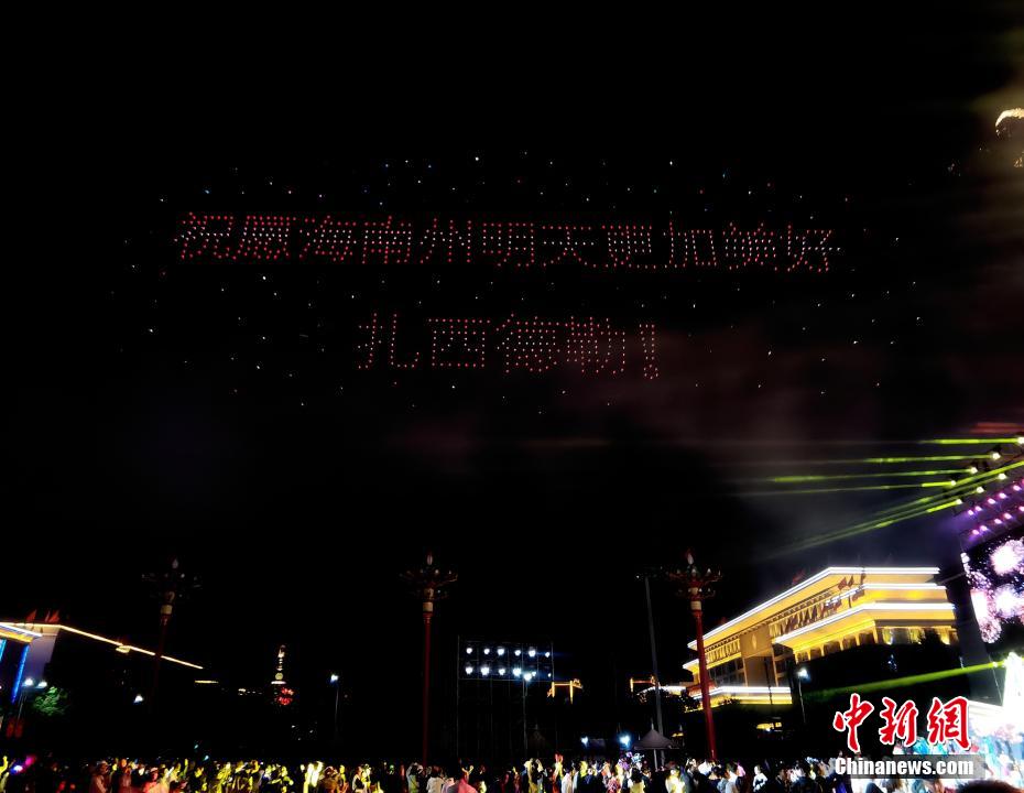 圖為無人機(jī)秀現(xiàn)場,無人機(jī)組成“祝愿海南州明天更加美好?扎西德勒”字樣。祁增蓓 攝