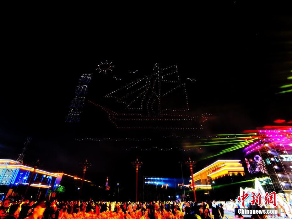 7月31日晚,青海省海南藏族自治州,800余架無人機(jī)騰空而起,以夜空為畫布,以燈光為畫筆,組成“光伏羊”“揚帆起航”“防沙治沙”“扎西德勒(藏語,意為吉祥如意)”等字樣,慶祝青海省海南藏族自治州成立70周年。