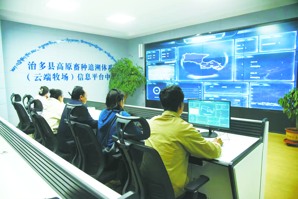 扎西才加介紹,現(xiàn)在只要通過手機輕輕一點,牦牛的性別、年齡、免疫信息甚至血統(tǒng)信息就能一覽無余。同時,這里的每個牛棚里都安裝了視頻監(jiān)控,通過數(shù)字中心智能環(huán)控、視頻監(jiān)控等,對牦牛養(yǎng)殖過程的各項要素進行數(shù)字化建模,數(shù)據(jù)也會實時傳輸?shù)健霸贫恕蹦翀鲳B(yǎng)殖管理系統(tǒng)平臺上,根據(jù)數(shù)據(jù)反饋,工作人員可以對牛棚溫度濕度等進行調(diào)整。