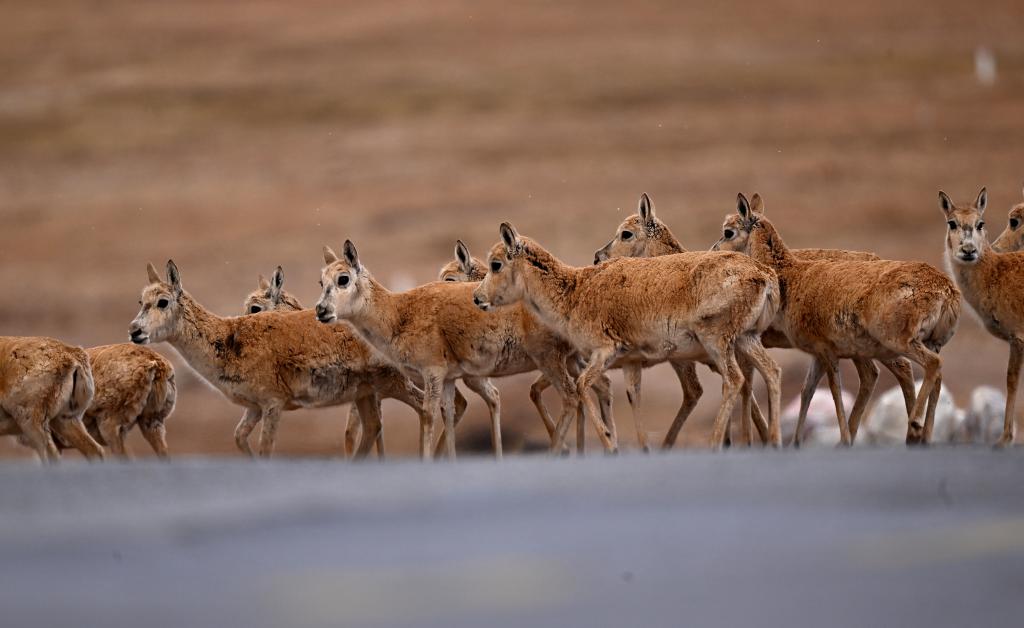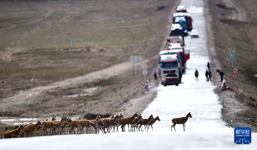 一群待產(chǎn)雌性藏羚羊正在通過青藏公路前往可可西里卓乃湖產(chǎn)仔(5月29日攝)。新華社記者 張宏祥 攝