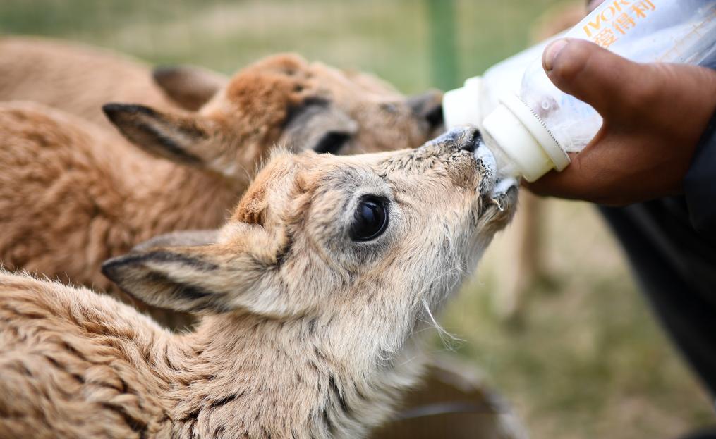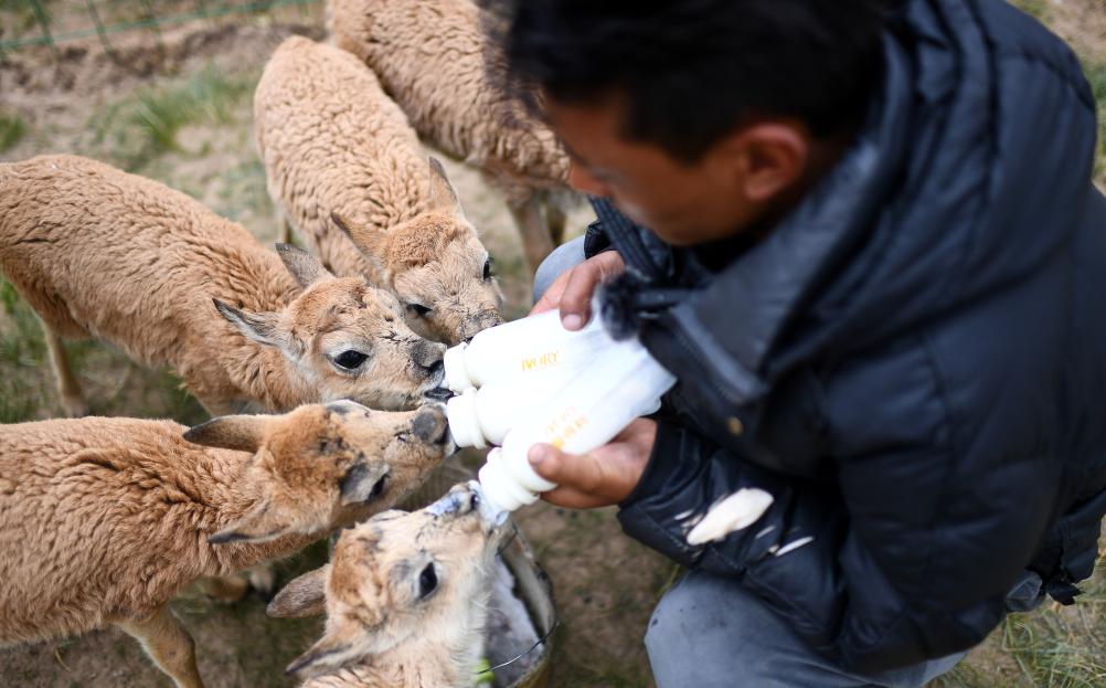 可可西里管理處索南達(dá)杰保護(hù)站隊(duì)員才仁多杰在給被救助的藏羚羊幼仔喂奶(7月28日攝)。新華社記者 張宏祥 攝