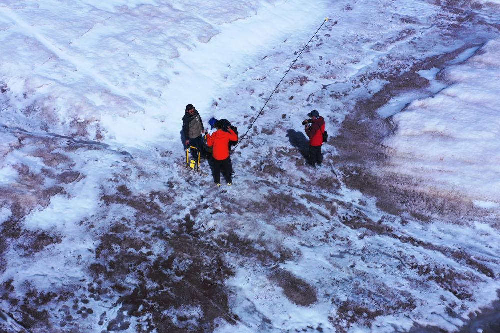 科考隊員在冰面上使用地質雷達探測冬克瑪?shù)妆ê穸龋?月27日攝)。新華社記者 陳杰 攝