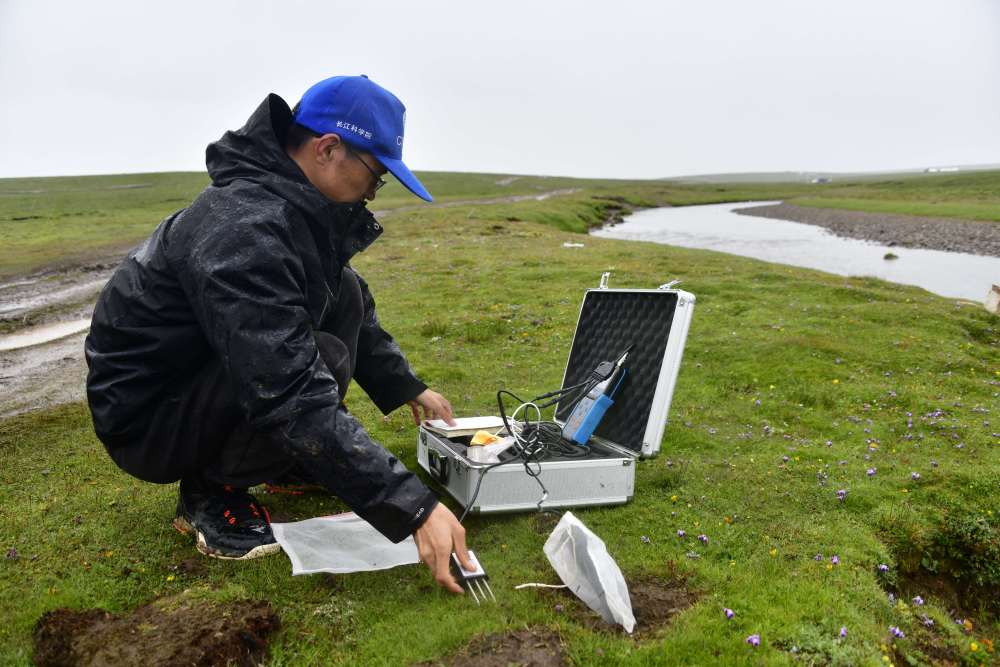 在查旦濕地,來自長江科學院空間信息技術應用研究所的科考隊員張雙印和隊友合作,用繩子圈出一個1平方米的正方形草地樣方,采集樣方內(nèi)的植被樣品;將圓柱形環(huán)刀釘入地下,采集土壤樣品。這些植被、土壤樣品將被送回實驗室,統(tǒng)一分析碳含量。