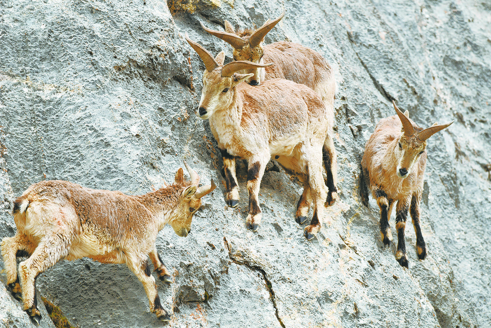 雪豹是山地黑夜的王者,崇山峻嶺間的山巖是它的專屬領(lǐng)地,它棲息在山巖朝陰的崖壁上。因此,次丁三人拍攝雪豹時(shí)會(huì)格外關(guān)注山巖朝陰的崖壁。