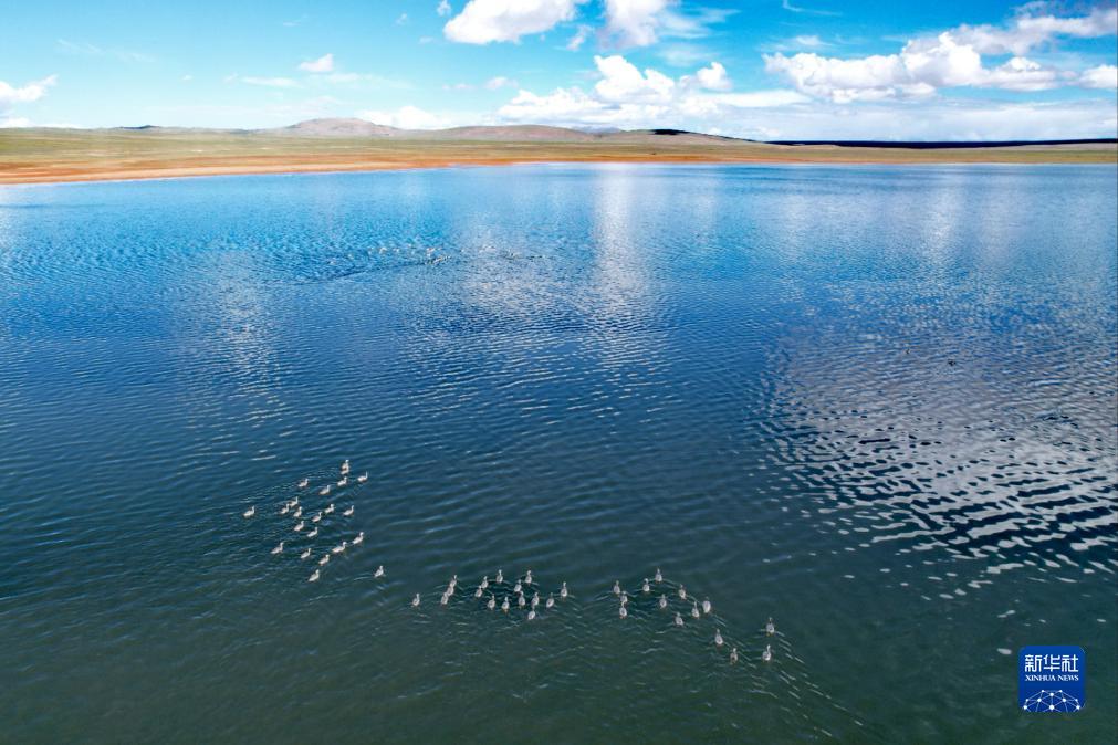 長(zhǎng)江源區(qū)的水鳥群(7月26日攝,無(wú)人機(jī)照片)。 新華社記者 劉詩(shī)平 攝