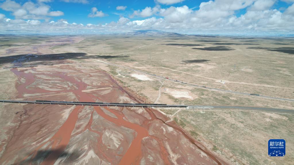 青藏鐵路列車通過楚瑪爾河(7月29日攝,無(wú)人機(jī)照片)。 新華社記者 劉詩(shī)平 攝