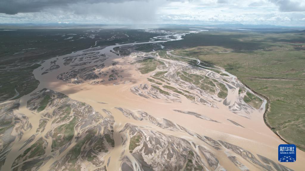 沱沱河與當(dāng)曲匯合處的囊極巴隴,辮狀河道寬度超過3千米(7月26日攝,無(wú)人機(jī)照片)。 新華社記者 劉詩(shī)平 攝