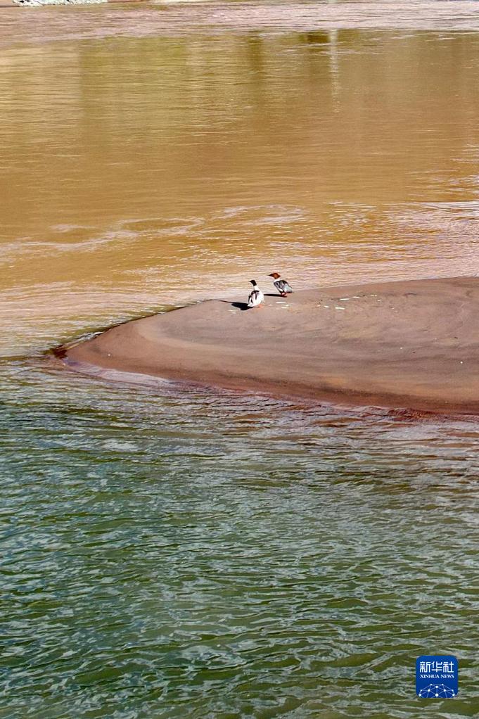 通天河與巴塘河交匯處的兩只水鳥(7月22日攝,無(wú)人機(jī)照片)。 新華社記者 劉詩(shī)平 攝