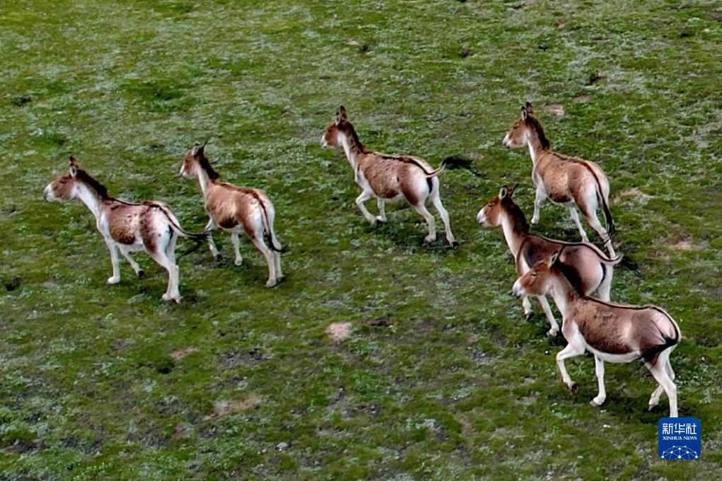 長(zhǎng)江源區(qū)的藏野驢(7月26日攝,無(wú)人機(jī)照片)。 新華社記者 劉詩(shī)平 攝