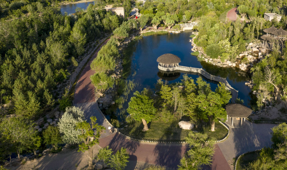 坐落在寧夏銀川市賀蘭山腳下的賀蘭山運動休閑公園(2021年5月27日攝,無人機照片)。這里曾是一片砂石采礦塌陷區(qū),當?shù)赝ㄟ^植被景觀再造、水系建設、現(xiàn)代管網(wǎng)鋪建等手段,重新利用廢石、廢坑及各類廢棄建筑材料,把這里變成一座免費開放的主題公園。新華社記者 馮開華 攝
