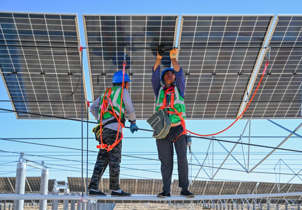2023年7月22日,工人在位于內蒙古杭錦旗庫布其沙漠億利生態(tài)示范區(qū)的蒙西基地庫布其200萬千瓦光伏治沙項目工地安裝光伏板。新華社記者 劉磊 攝