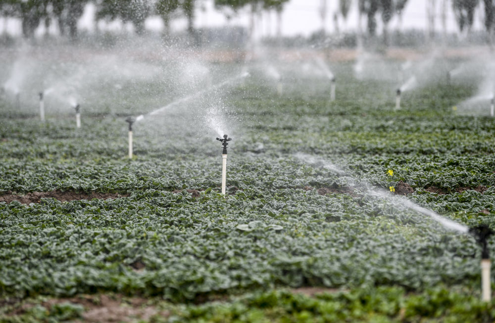 2023年5月25日,在寧夏銀川市永寧縣望洪鎮(zhèn)宋澄村冷涼蔬菜種植基地,小型噴灌節(jié)水設備在進行噴灌作業(yè)。新華社記者 馮開華 攝