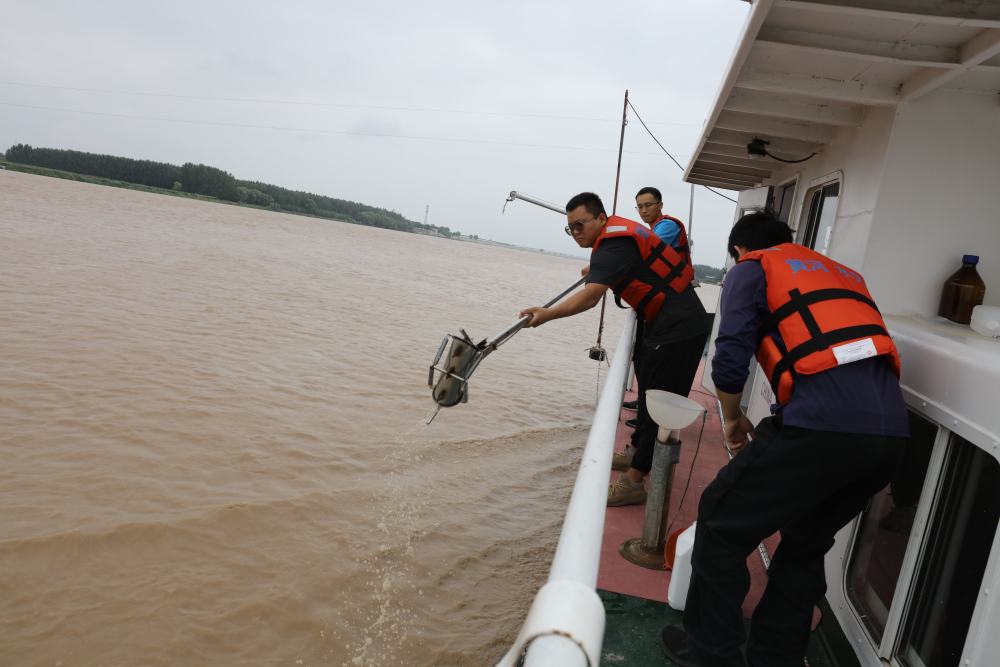 2023年6月29日,調水調沙期間,黃河下游利津水文站工作人員在進行取沙作業(yè)。新華社記者 劉詩平 攝