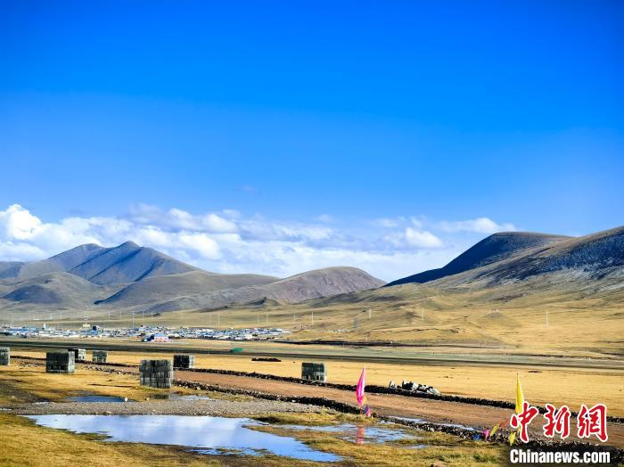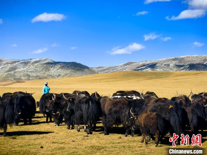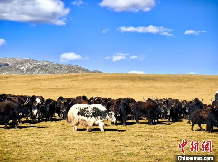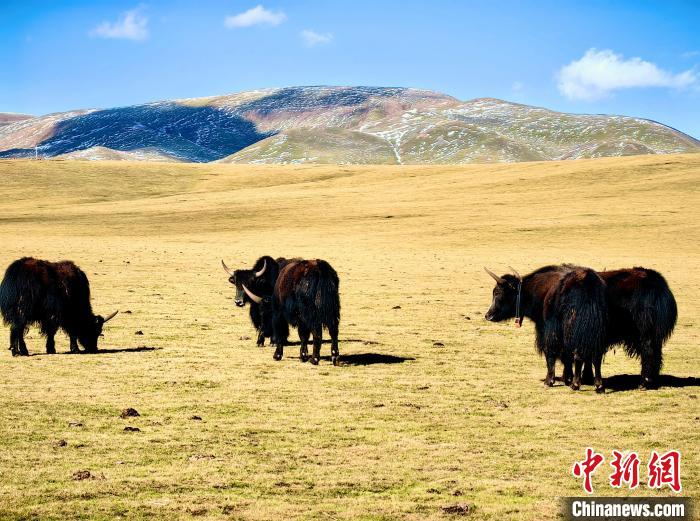 9月20日,青海省玉樹藏族自治州曲麻萊縣生態(tài)牧場(chǎng)牧草已逐漸泛黃。藍(lán)天白云下,遼闊的金色草原間,成群的牦牛正悠閑吃草,成為秋日草原一道靚麗風(fēng)景線。