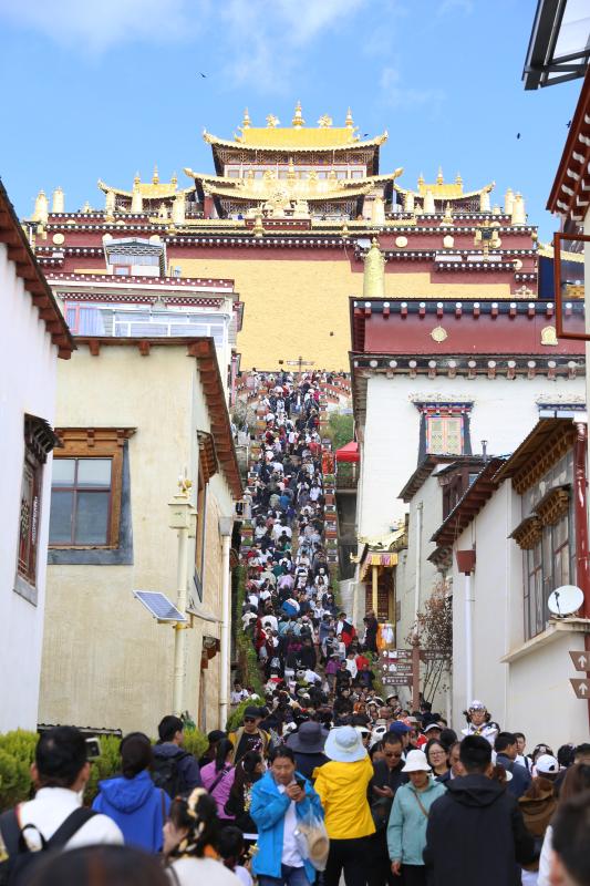 擁有著“小布達(dá)拉宮”和“藏族藝術(shù)博物館”之稱的噶丹·松贊林寺人氣高漲,不少游客身著藏民族服飾欣喜地在景區(qū)寺院的金頂、黃墻下合影留念。景區(qū)外車(chē)水馬龍,停車(chē)場(chǎng)及公路沿線兩側(cè)停滿了來(lái)自全國(guó)各地的自駕游車(chē)輛,交警及景區(qū)工作人員井然有序的指揮著交通。景區(qū)內(nèi),游客源源不斷,在上車(chē)點(diǎn)排起了長(zhǎng)隊(duì),工作人員忙碌地指引著游客按秩序檢票上車(chē),“人實(shí)在太多了,假期以來(lái)從早上7點(diǎn)至晚上7點(diǎn)半都有游客進(jìn)出,19輛擺渡車(chē)都在不停運(yùn)行?!币晃痪皡^(qū)工作人員告訴記者。