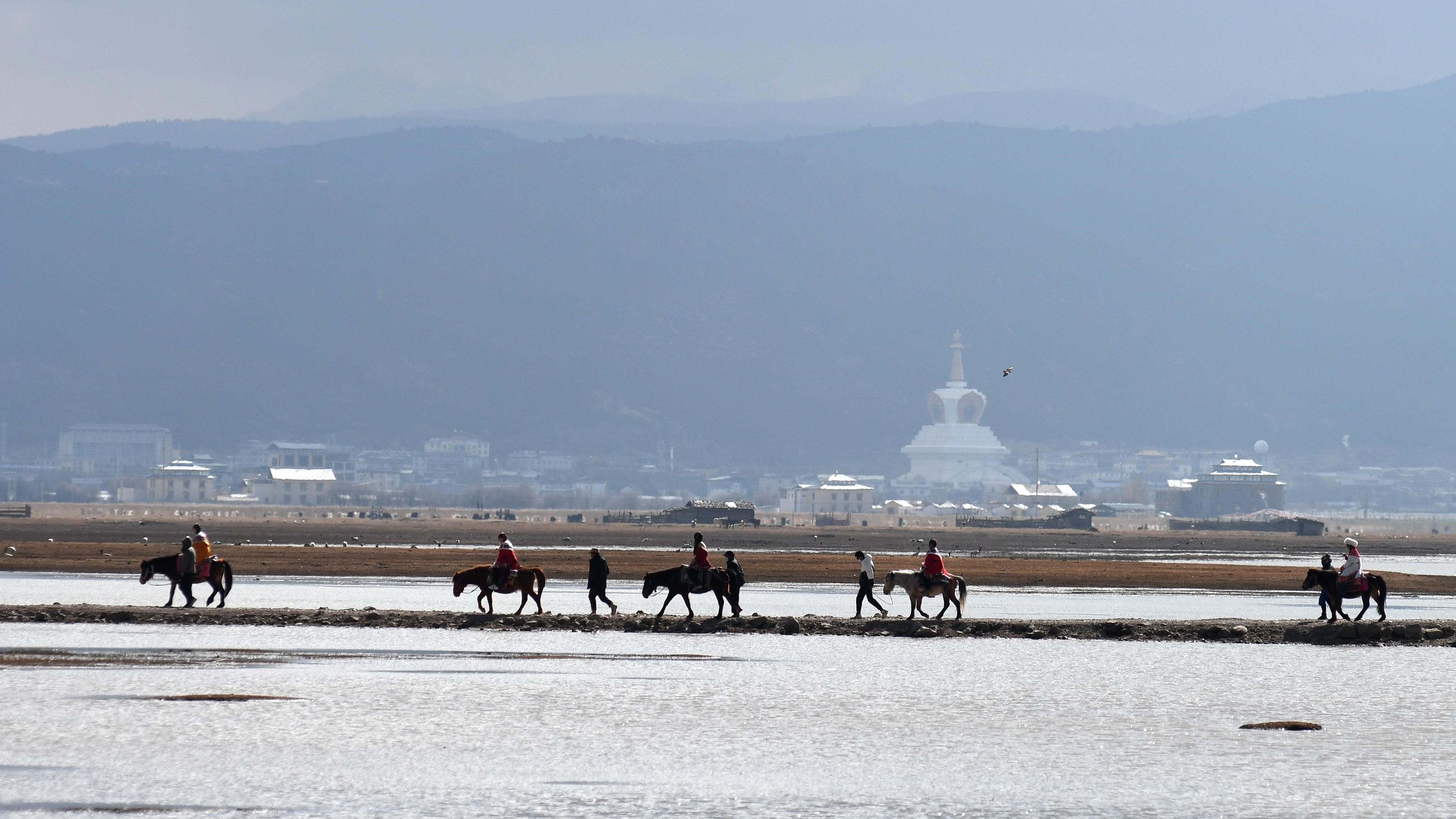 冬季的普達(dá)措景區(qū),林濤載水聲,藍(lán)天伴幽湖,寧靜無喧囂;冬季的納帕海,皚皚白雪成為了黑頸鶴、黑鸛、白尾海雕、斑頭雁等珍稀的鳥類自由作畫的繪本;冬季的噶丹·松贊林寺,當(dāng)?shù)谝豢|陽光灑向寺廟的金頂,若隱若現(xiàn)的云霧和裊裊桑煙下藏著人間仙境;冬季的獨(dú)克宗古城,綿綿白雪裝飾著藏式民居,穿著民族服裝的人們踏著青石板路緩緩走過,美好而生動。