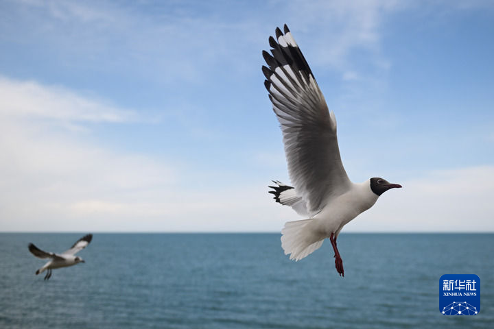 這是5月17日拍攝的在青海省海南藏族自治州共和縣黑馬河鎮(zhèn)境內(nèi)青海湖上飛翔的棕頭鷗。新華社記者 張龍 攝