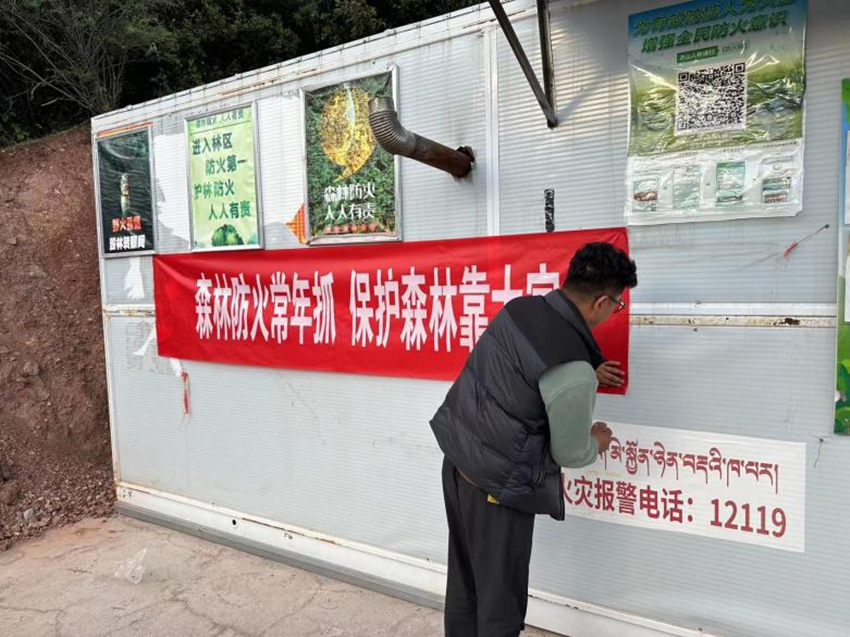 張貼森林防火宣傳標(biāo)語(yǔ)。