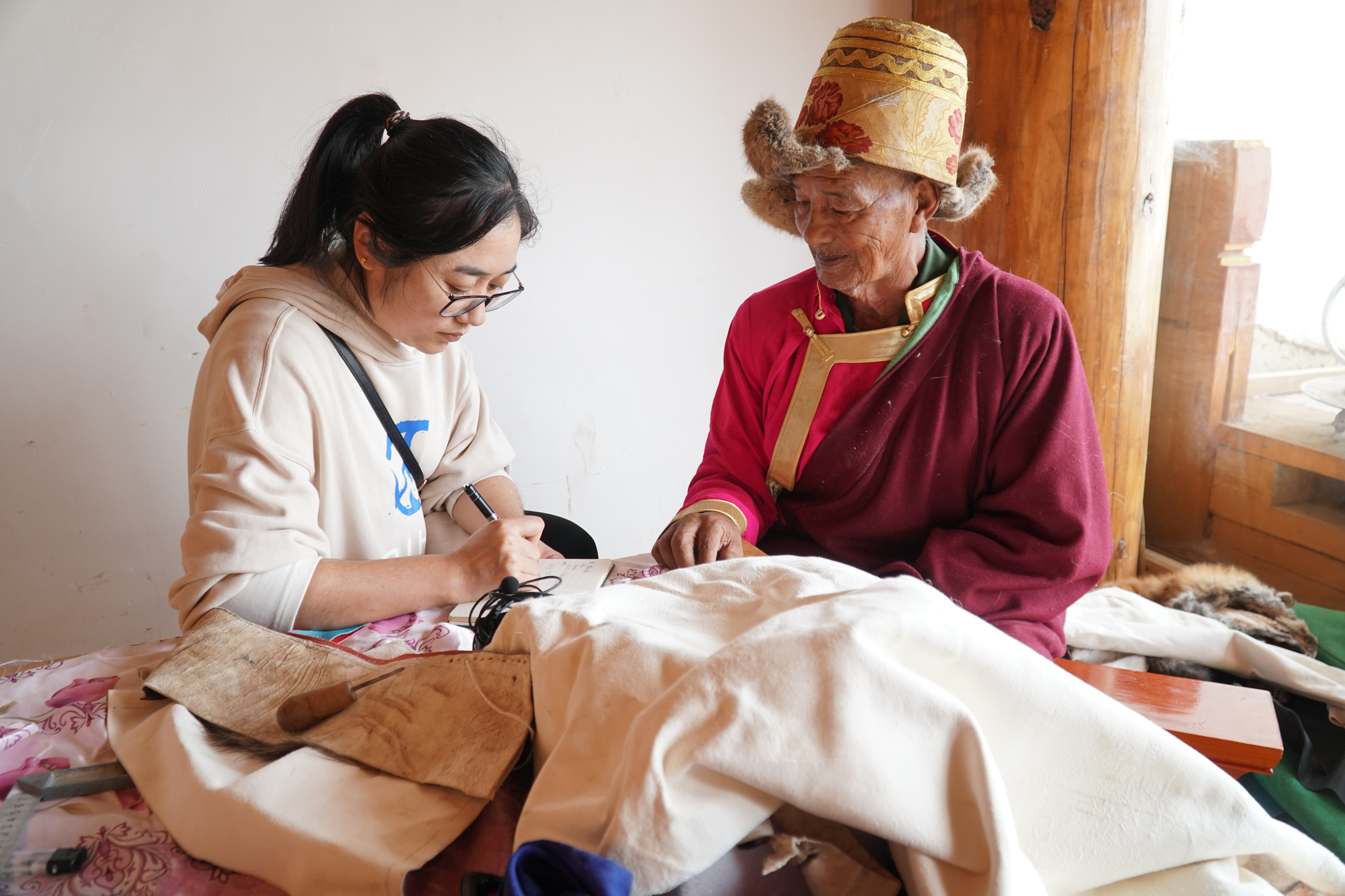 迪慶日報社記者萬瑪措在香格里拉市小中甸采訪州級皮革制作技藝傳承人。