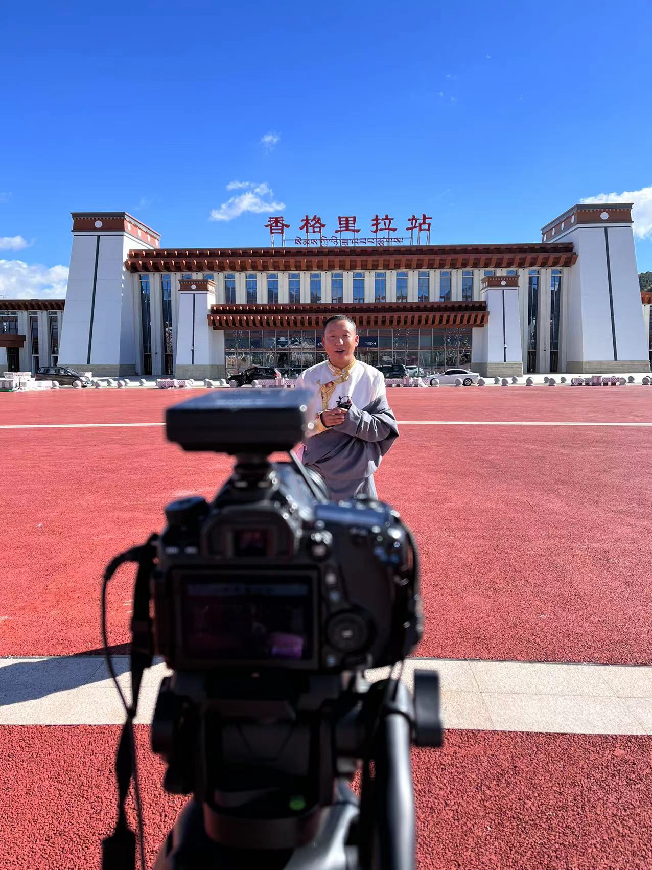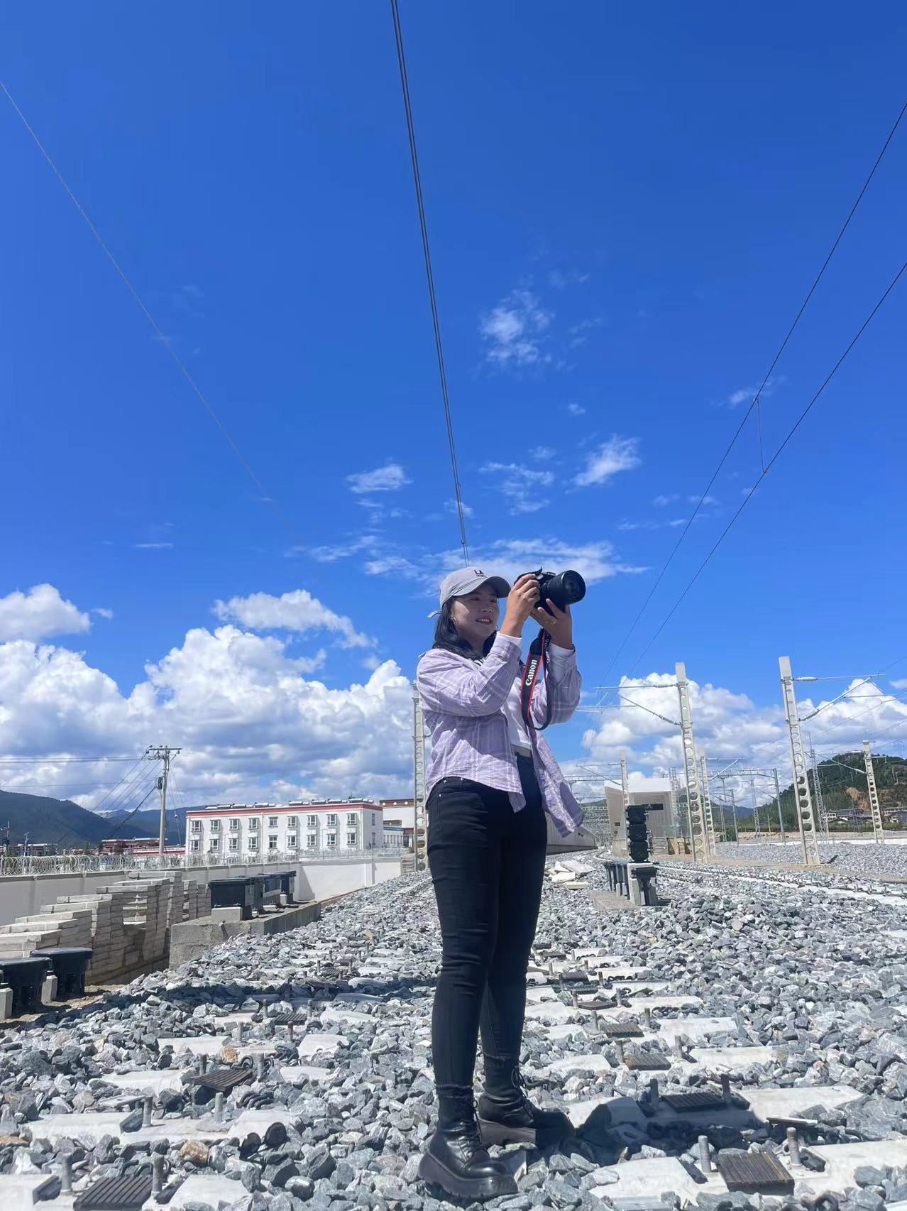 迪慶日報社記者央金拉姆在香格里拉火車站拍攝鐵路鋪軌情況。