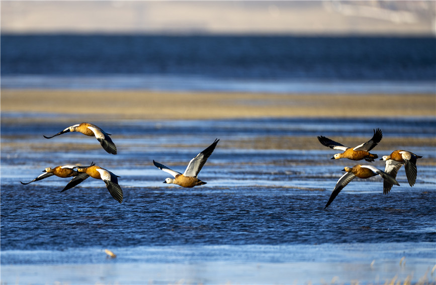 湖面上成群結(jié)隊(duì)的赤麻鴨紛紛翔集,時(shí)而靜臥水面,時(shí)而振翅齊飛、時(shí)而追逐嬉戲、時(shí)而潛水覓食,場(chǎng)面蔚為壯觀(guān),為初冬的青海湖帶來(lái)了美麗的色彩和無(wú)限生機(jī)。