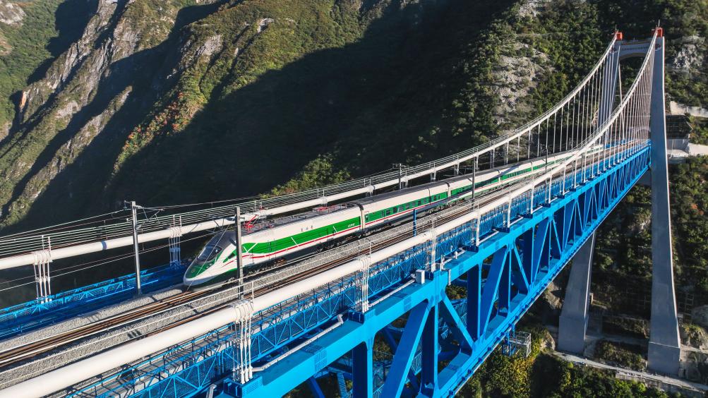 圖為11月9日,麗香鐵路動(dòng)態(tài)檢測期間,復(fù)興號(hào)列車駛過虎跳峽金沙江鐵路大橋。(中國鐵路昆明局集團(tuán)公司供圖)