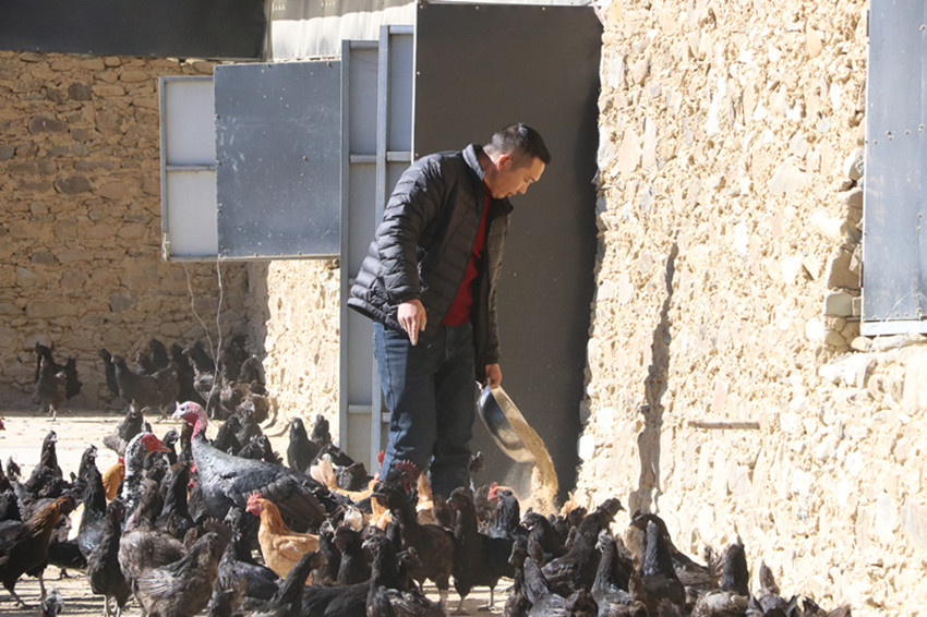 “我們這里的雞都是放養(yǎng),也會給它們喂一些發(fā)酵后的酒糟、玉米等,這樣養(yǎng)出的藏香雞肉質(zhì)鮮美、緊實,不愁賣不出。雞場常規(guī)存欄量在一萬一千羽左右,目前還有7000多羽,其中蛋雞近2000羽?,F(xiàn)在天氣冷,蛋雞每天可以產(chǎn)800到1000枚雞蛋,平時高峰期,日產(chǎn)蛋基本在1500枚左右?!苯?jīng)過全身消殺,李厚新帶著我們走進位于木拉鎮(zhèn)曲呷村的藏香雞養(yǎng)殖場。