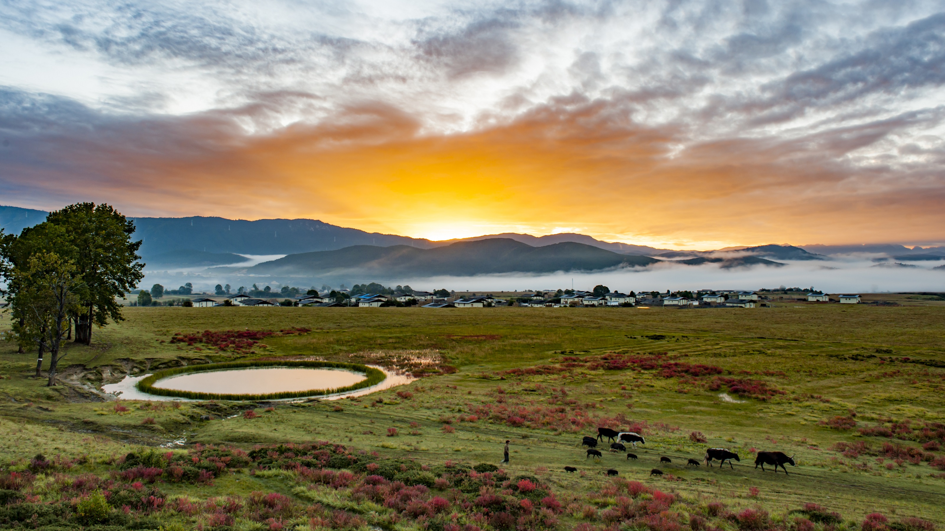 金秋時(shí)節(jié),小中甸就換上了絢麗的秋裝,火紅的狼毒花鋪滿了整個(gè)草原,與五彩繽紛的森林交相輝映,絢麗奪目。