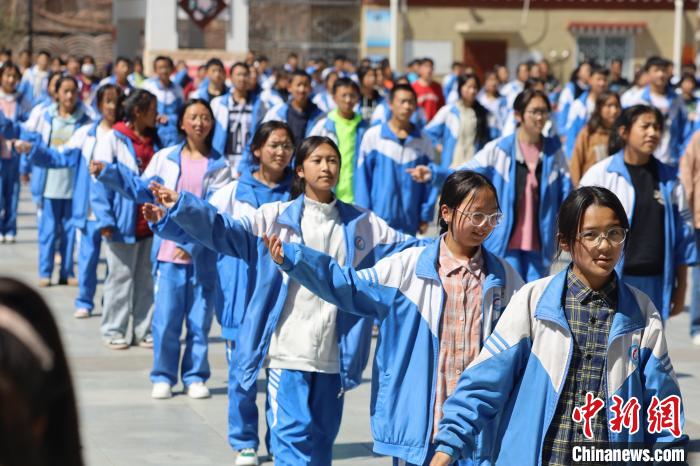 課間操時,呷拉鎮(zhèn)初級中學的學生在操場上跳藏族鍋莊舞。王鵬 攝