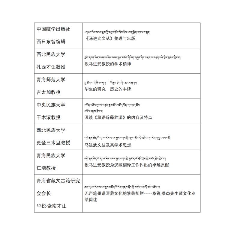 在學(xué)術(shù)交流會(huì)上,中國藏學(xué)出版社西日東智編輯、青海師范大學(xué)吉太加教授、西北民族大學(xué)扎西才讓教授、中央民族大學(xué)干木滾教授、西北民族大學(xué)更登三木旦教授、青海民族大學(xué)仁增教授、青海省藏文古籍研究會(huì)會(huì)長華銳·索南才讓圍繞《馬進(jìn)武文叢》的整理與出版、《馬進(jìn)武文叢》的內(nèi)容特點(diǎn)與馬進(jìn)武教授的學(xué)術(shù)思想與學(xué)術(shù)貢獻(xiàn)等主題展開學(xué)術(shù)交流。