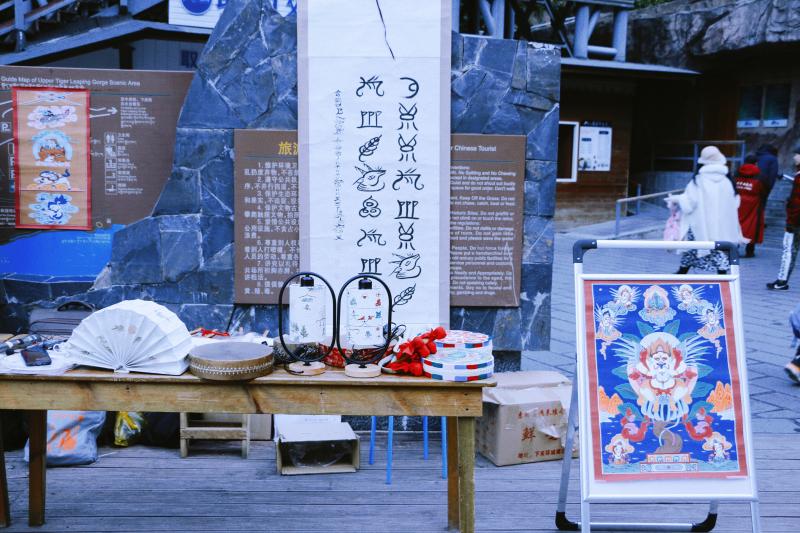 圖為非物質文化傳承人和桂全現(xiàn)場演示納西族傳統(tǒng)造紙術,展示東巴畫、十二生肖布畫、東巴鼓等非遺產(chǎn)品,并免費為游客寫東巴文、畫十二生肖。