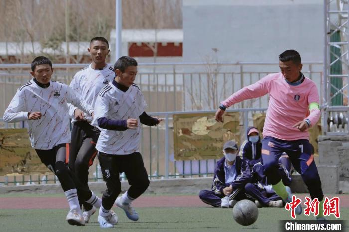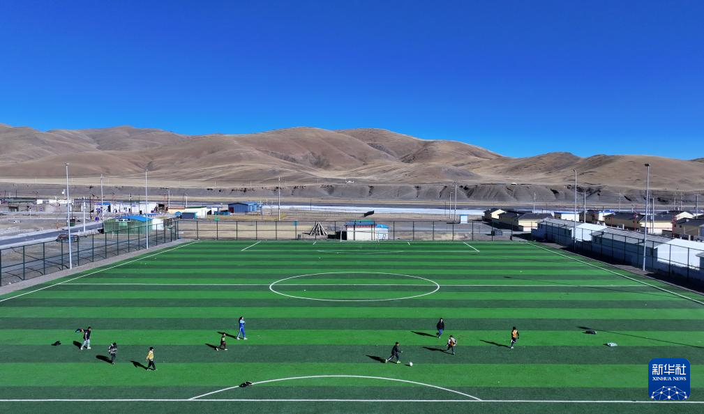 1月12日,孩子們?cè)谇嗪S駱淝槿R縣葉格鄉(xiāng)足球場(chǎng)上踢球(無人機(jī)照片)。新華社記者 韓方方 攝