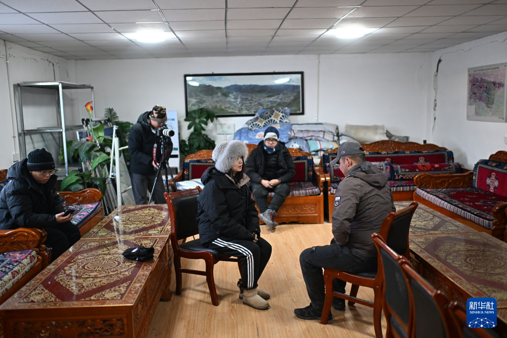 記者在索南達(dá)杰保護(hù)站宿舍內(nèi)采訪巡山隊(duì)員(1月19日攝)。新華社記者 張宏祥 攝