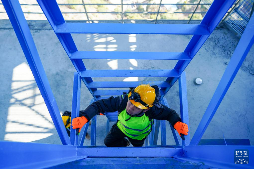 1月24日,工區(qū)職工趙澗泉在通過(guò)檢修爬梯。新華社記者 陳欣波 攝