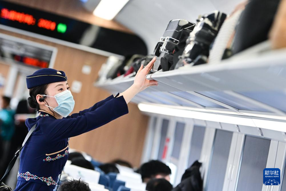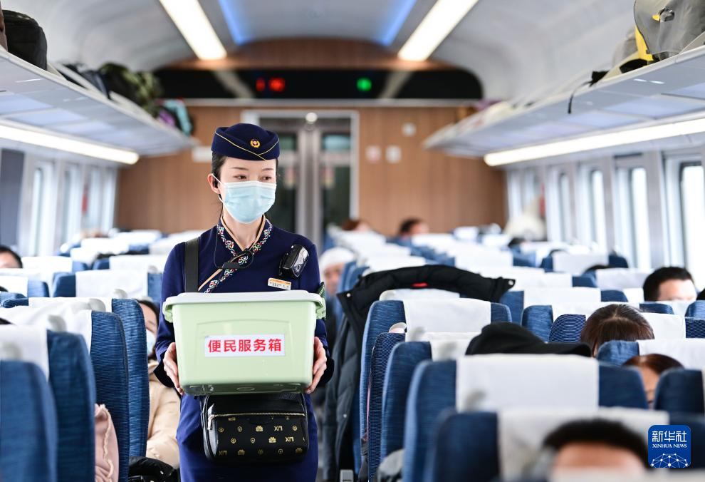 1月30日,中國鐵路青藏集團有限公司西寧客運段動車隊乘務員王璐在為旅客服務。新華社記者 張龍 攝