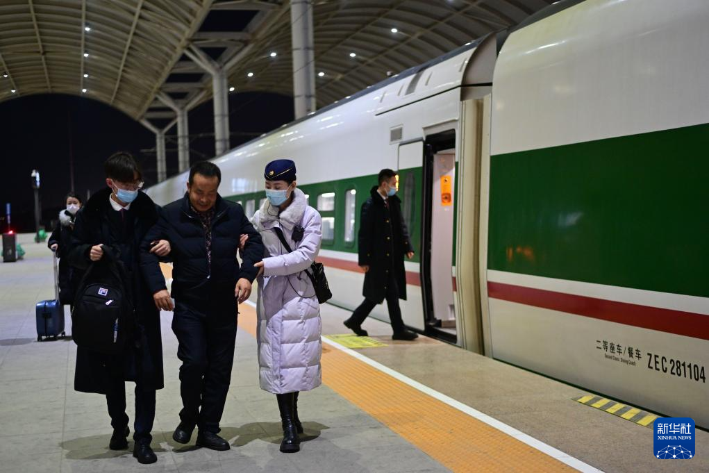 1月30日,中國鐵路青藏集團有限公司西寧客運段動車隊西格八組乘務員陳麗琴在協(xié)助重點旅客下車。新華社記者 張龍 攝