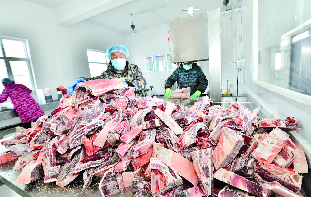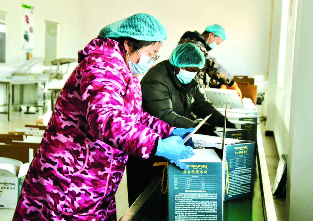 1月24日,記者走進青海省海西蒙古族藏族自治州格爾木市唐古拉山鎮(zhèn)長江源村的唐古拉牦牛、藏羊精深加工基地,車間內(nèi)屠宰、冷凍、包裝等功能區(qū)劃分明確,一應俱全。忙碌的生產(chǎn)線上,身穿食品加工工作服的工作人員正沿著流水線緊張有序地工作。剔骨、粗分完成后,工作人員再按不同部位精準分割、整齊打包,等待銷售發(fā)貨,全力保障年貨產(chǎn)品的市場供應。長江源村駐村第一書記梁亮告訴記者:“臨近春節(jié),牛羊肉禮盒備受青睞,浙江、江蘇、西藏等地的訂單也比平時增加了很多。牛羊肉產(chǎn)業(yè)鏈的延伸,成為了我們長江源村鄉(xiāng)村振興的又一把‘金鑰匙’?!?/p>