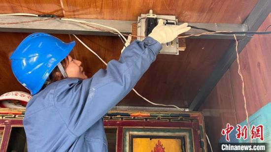 圖為扎西拉毛在結(jié)拉村義務檢查線路和更換開關。普布永措 攝