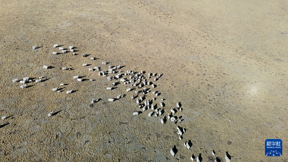 1月27日,在青海省海北藏族自治州剛察縣泉吉鄉(xiāng)寧夏村,羊群正在覓食(無人機圖片)。任元昊 攝